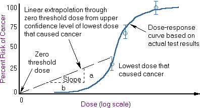 EPA uses the Linearized Multistage Model (LMS) illustrated above to conduct its cancer risk assessments. It yields a cancer slope factor, known as the q1* (pronounced Q1-star) which can be used to predict cancer risk at a specific dose. It assumes linear extrapolation with a zero dose threshold from the upper confidence level of the lowest dose that produced cancer in an animal test or in a human