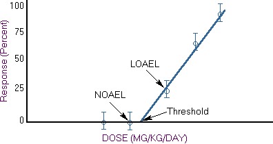 A dose response curve for non-carcinogenic effects is illustrated above which also identifies the NOAEL and LOAEL. Any toxic effect might be used for the NOAEL/LOAEL so long as it is the most sensitive toxic effect and considered likely to occur in humans.