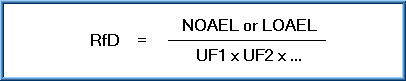 The more uncertain or unreliable the data becomes, the higher will be the total uncertainty factor that is applied. An example of an RfD calculation is provided below. A subchronic animal study with a LOAEL of 50 mg/kg/day was used. Thus the uncertainty factors are: 10 for human variability, 10 for an animal study, 10 for less than chronic exposure, and 10 for use of an LOAEL instead of a NOAEL.