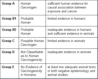 epidemiology studies, animal bioassay data, and biological activity (e.g., mutagenicity). The substance is classified as to carcinogenic risk to humans based on the weight of evidence. If the evidence is sufficient, the substance may be classified as a definite, probable or possible human carcinogen.