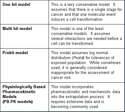 The procedures used to extrapolate from high to low doses are different for assessment of carcinogenic effects and non-carcinogenic effects. Carcinogenic effects are not considered to have a threshold and mathematical models are generally used to provide estimates of carcinogenic risk at very low dose levels.