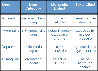Examples of drugs that build up to toxic levels in slow metabolizers that have specific genetic-related defects in biotransforming enzymes are listed below: