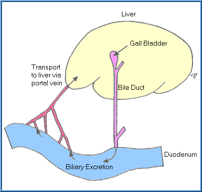 Once a substance has been excreted by the liver into the bile, and subsequently into the intestinal tract, it can then be eliminated from the body in the feces, or it may be reabsorbed. Since most of the substances excreted in the bile are water soluble, they are not likely to be reabsorbed as such. However, enzymes in the intestinal flora are capable of hydrolyzing some glucuronide and sulfate conjugates, which can release the less polar compounds that may then be reabsorbed. This process of excretion into the intestinal tract via the bile and reabsorption and return to the liver by the portal circulation is known as the enterohepatic circulation.